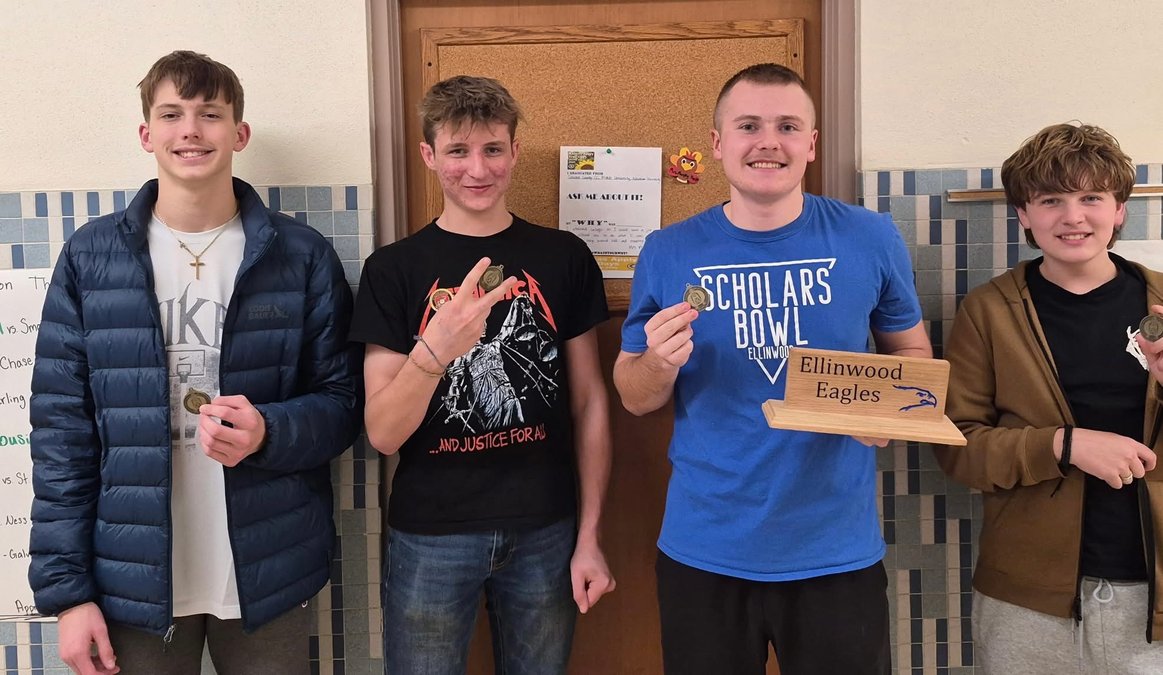 Ellinwood High School’s varsity Scholars Bowl squad competed at Central Plains on Thursday, Jan. 8. They went 4-1 in pool play and then 3-0 in finals to take 1st place. Pictured are, from left: Kellan Behnke, Russell Kern, Banks Jacobs and Carter Komarek.