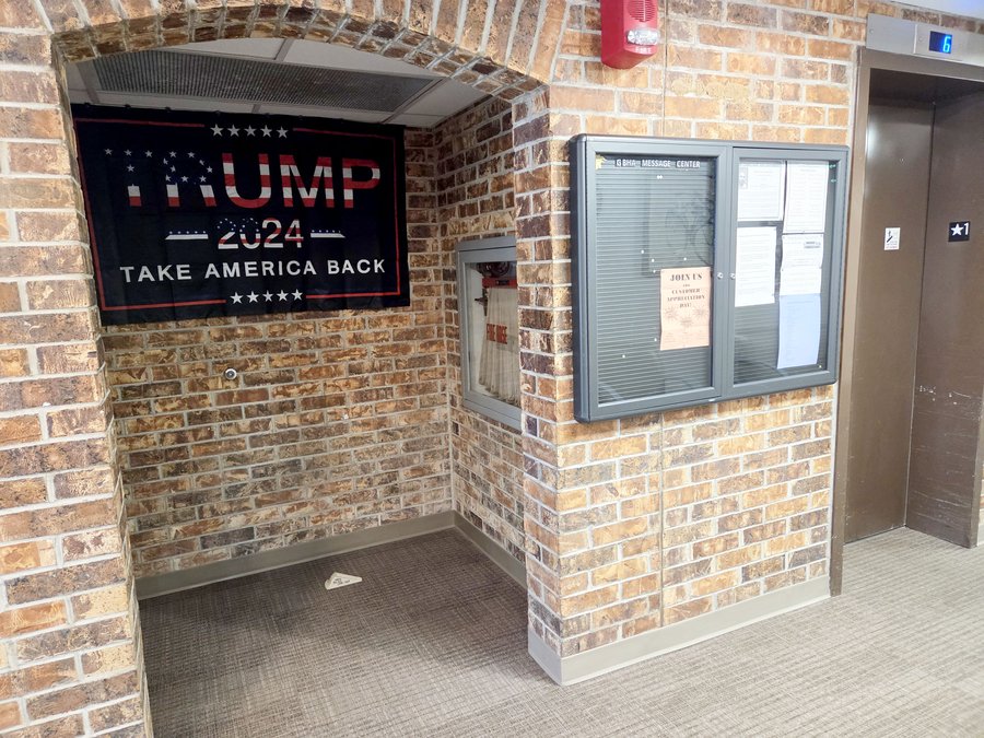 A resident of the Great Bend Housing Authority (GBHA), better known at the High Rise apartments, is unhappy with a political, pro-Trump flag hanging in the lobby. He has complained to the manager, who told the Great Bend Tribune she is exercising her First Amendment right to free speech and does not intend to remove the flag.